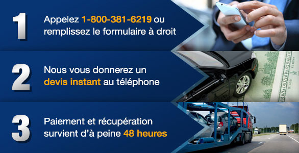 Appelez le (+1) 800 381 6219 ou remplissez le formulaire figurant à droite pour obtenir votre devis GRATUIT sans engagement! Nous reprenons des voitures dans n’importe quel état et pouvons même procéder à la récupération à votre place. C’est simple, sûr et rapide.